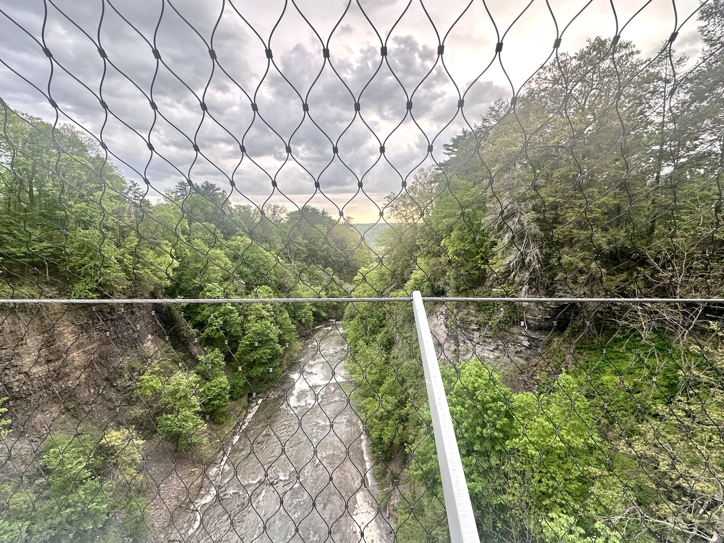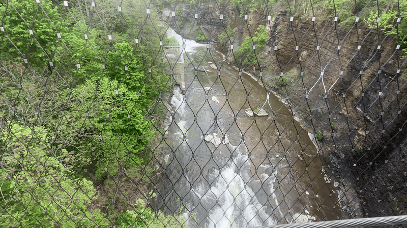 Safety nets were added to the bridge, and nearly a dozen other bridges in the area, by Cornell University to prevent student suicides, circa 2010.