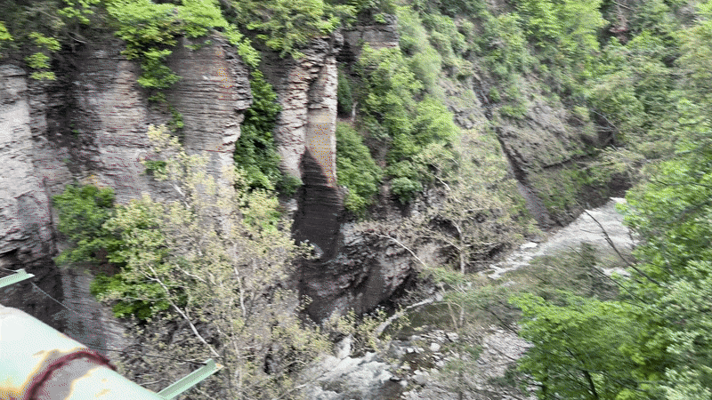Amazingly, Aunt Sarah’s Falls is well over several hundred feet tall from the top of the gorge, but the top two-thirds is not visible or accessible. According to waterfall website NYFalls.com, Aunt Sarah’s Falls first free-falls about a third of the way, then fans out on a steep slope of shale for another third before free-falling again into a shallow plunge pool. That final third is the part travelers can see from the roadway. I parked in a small lot adjacent to the pool for the videos and photos I took; you can likely do the same, although beware of traffic entering the lot quickly on busier days. There is also a small parking lot across the street.