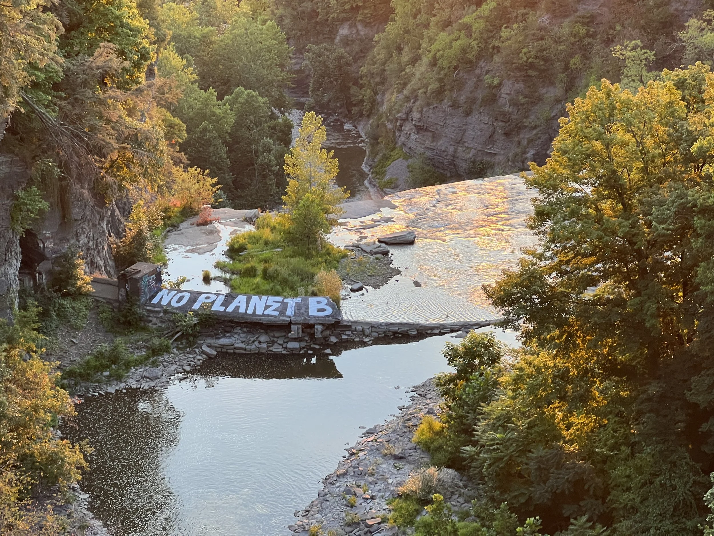 Ithaca is a very liberal city, largely in part due to its proximity to Cornell. Locals sometimes refer to it as “Little Portland”. It was common to see Priuses here before they were popular elsewhere, and a large number of Teslas and other EVs have graced the city’s streets, far more per capita (in my estimation) than other areas of upstate New York. Ithaca is filled with activism, with folks fighting for equality and equity, against food insecurity and hunger, and against climate change. The day we pre-tripped our Taughannock Falls camping weekend, “Hands Off” protests were taking place across the country, and we decided to drive into the city and visit the Ithaca Commons, where more than 300 people lined the streets holding signs in protest. Signs and murals throughout Ithaca point raise alarms about the environment.
